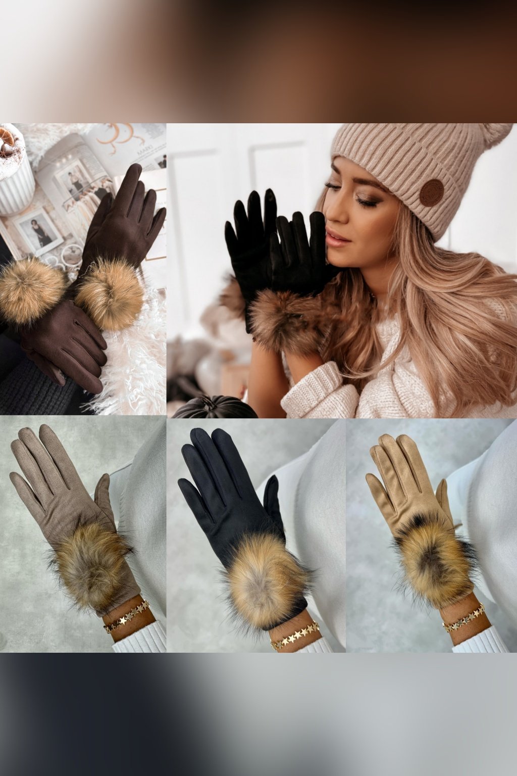 Rukavice z imitace semiše, ozvláštněné ozdobnou bambulí z přírodní kožešiny. Tento produkt se stane mimořádně módním doplňkem mnoha zimních stylizací. Ukazováček a palec jsou navíc vybaveny speciálními aplikacemi, které umožňují bezproblémové používání telefonu. Dostupné ve dvou barevných provedeních.