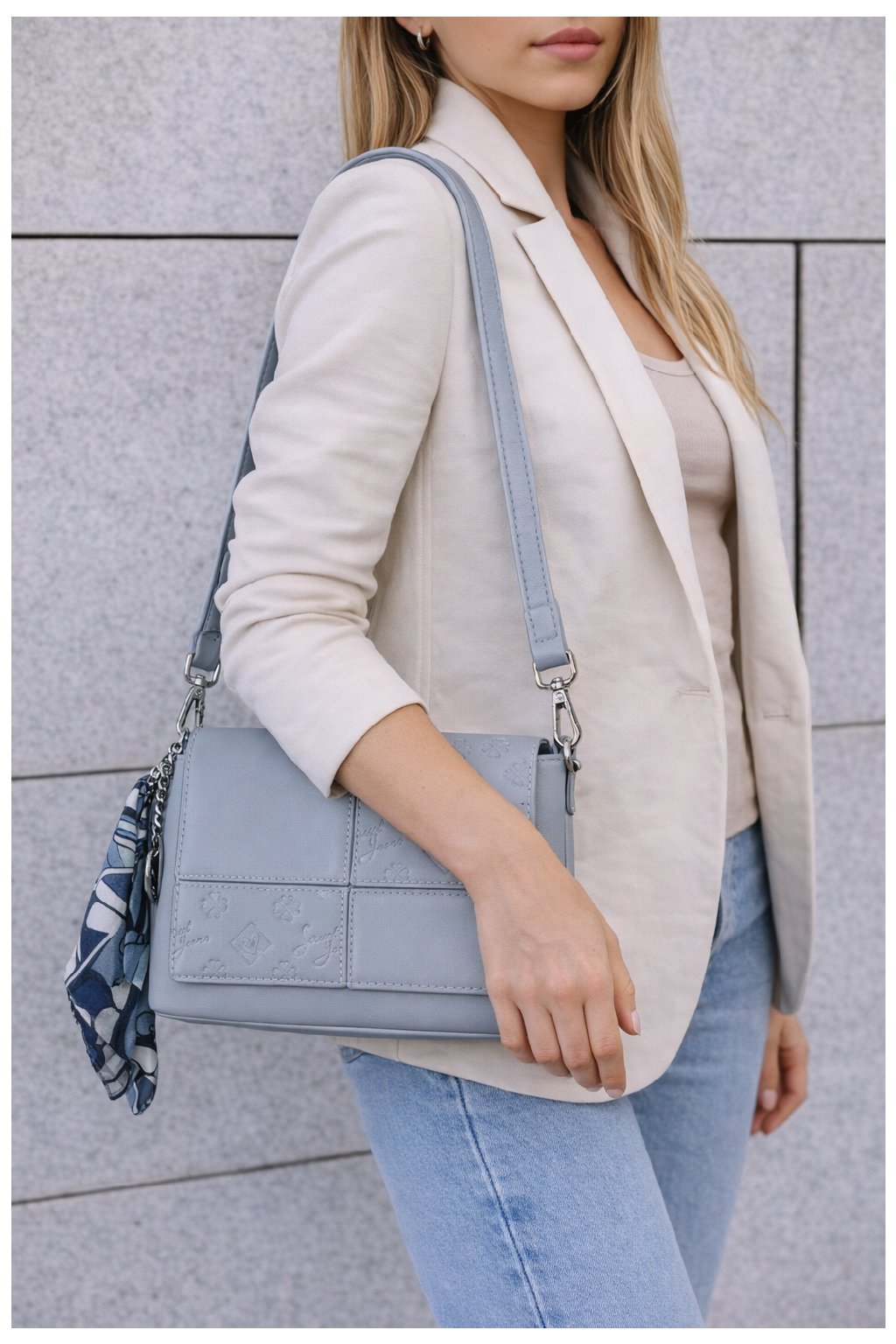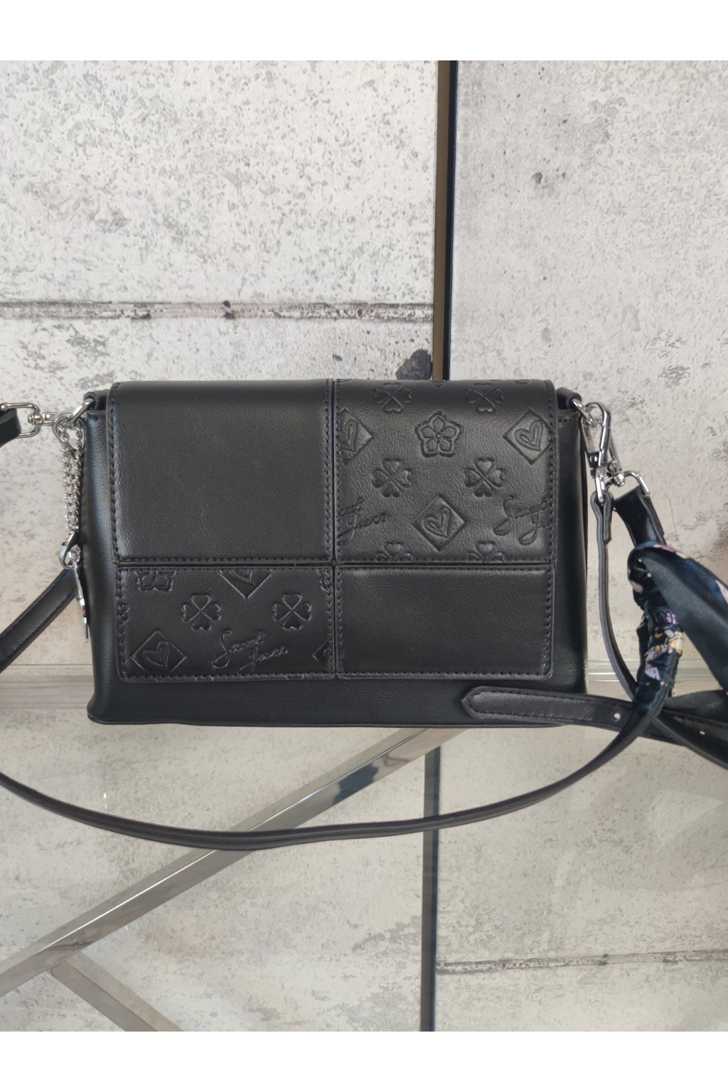 Jeden popruh zdobený módním šátkem.