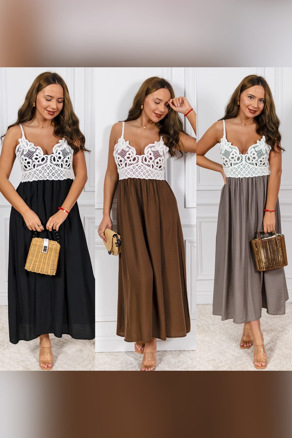 Dlouhé letní šaty z viskózy, výstřih zdobený krajkou, rozšířený střih.