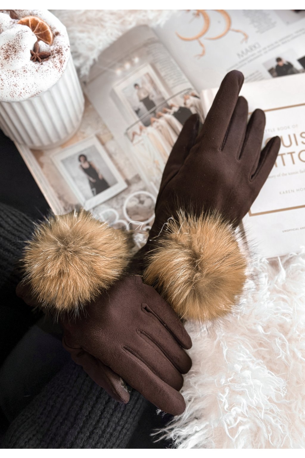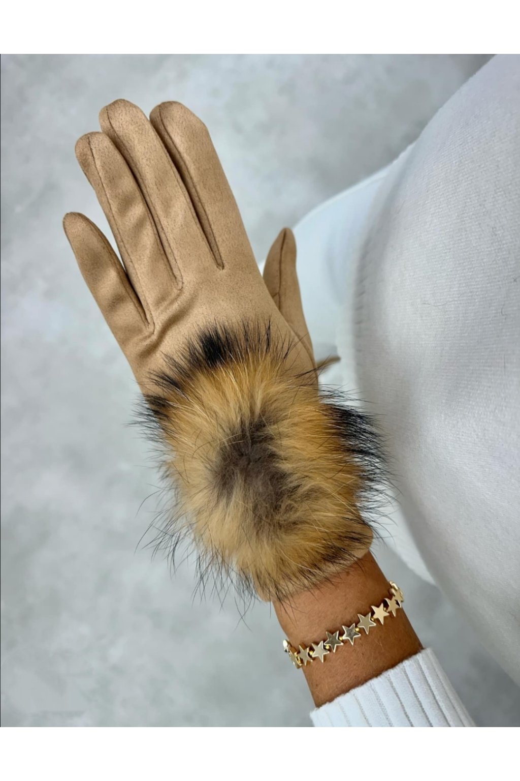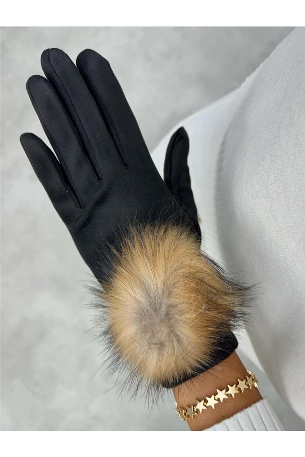 Rukavice z imitace semiše, ozvláštněné ozdobnou bambulí z přírodní kožešiny. Tento produkt se stane mimořádně módním doplňkem mnoha zimních stylizací. Ukazováček a palec jsou navíc vybaveny speciálními aplikacemi, které umožňují bezproblémové používání telefonu. Dostupné ve dvou barevných provedeních.