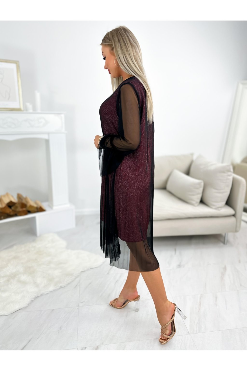 Průhledné rukávy jsou zakončeny volánky. Látka pod tylem je vyrobena z lesklé látky.