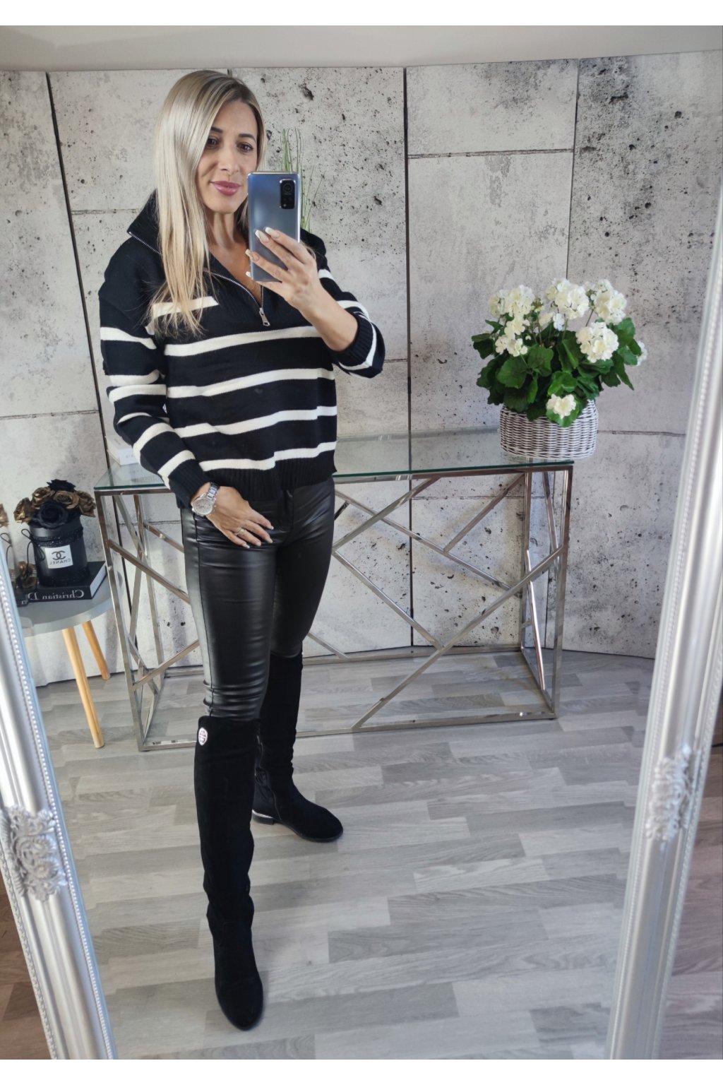 Velký límec se zapínáním na stříbrný zip lze nosit na více způsobů.